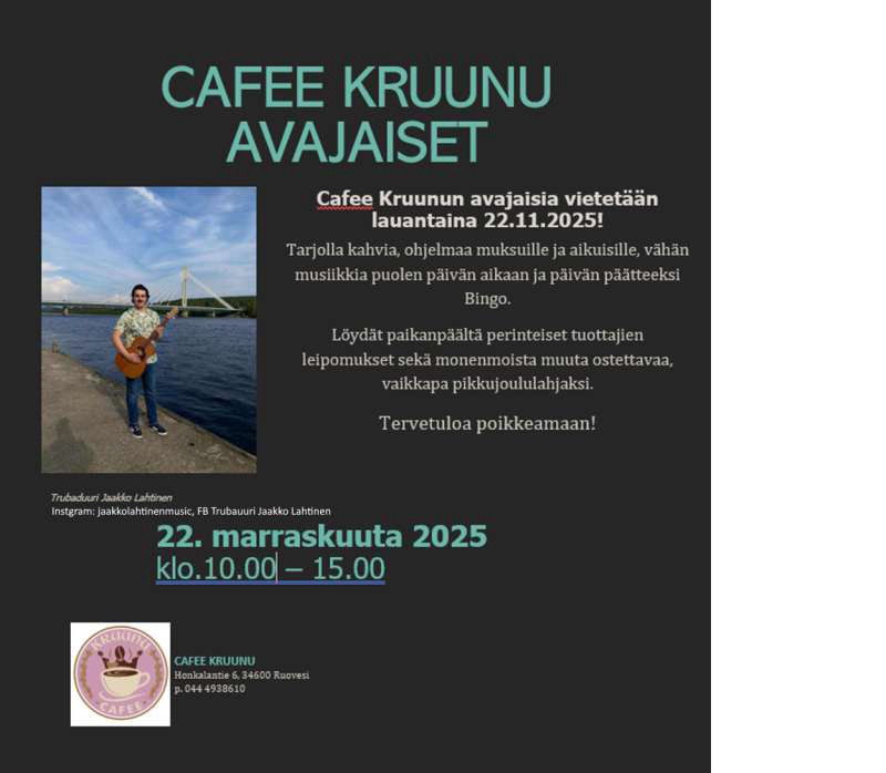 Cafee Kruunulla on tarjolla päivittäin kahvia, sämpylää ja leivonnaisia. Tiistaisin on saatavilla myös Tapolan mustaa makkaraa, syötäväksi paikan päällä tai osta mukaan.